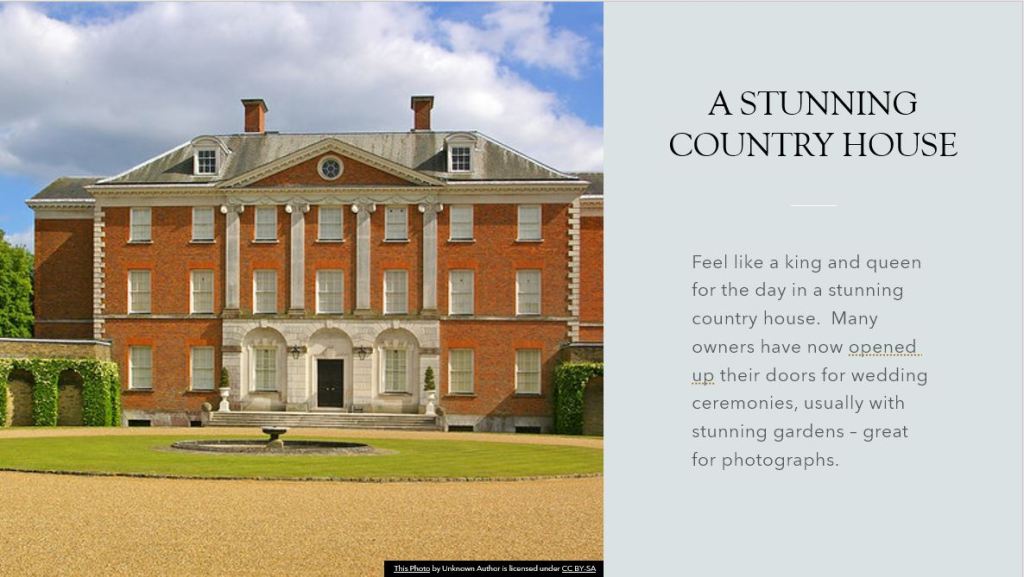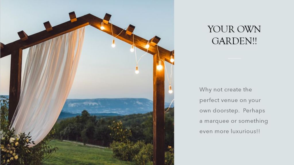 The setting of your wedding is entirely up to you, perhaps you’ve always dreamt of a beach wedding or a forest wedding, top of a mountain, gardens, historic houses, the possibilities are endless and just down to what you want and your imagination.