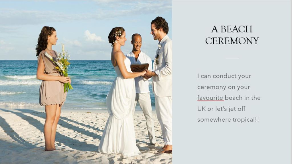 Now you are engaged, presumably you are deciding on where, when and what options are available to you to ensure your special day is as special as you are. You maybe thinking of ways you can have a ceremony that is truly unique to you and your partner without the confines of tradition. I am able to offer various ceremonies which can be made unique to you as a couple, such as the following:-